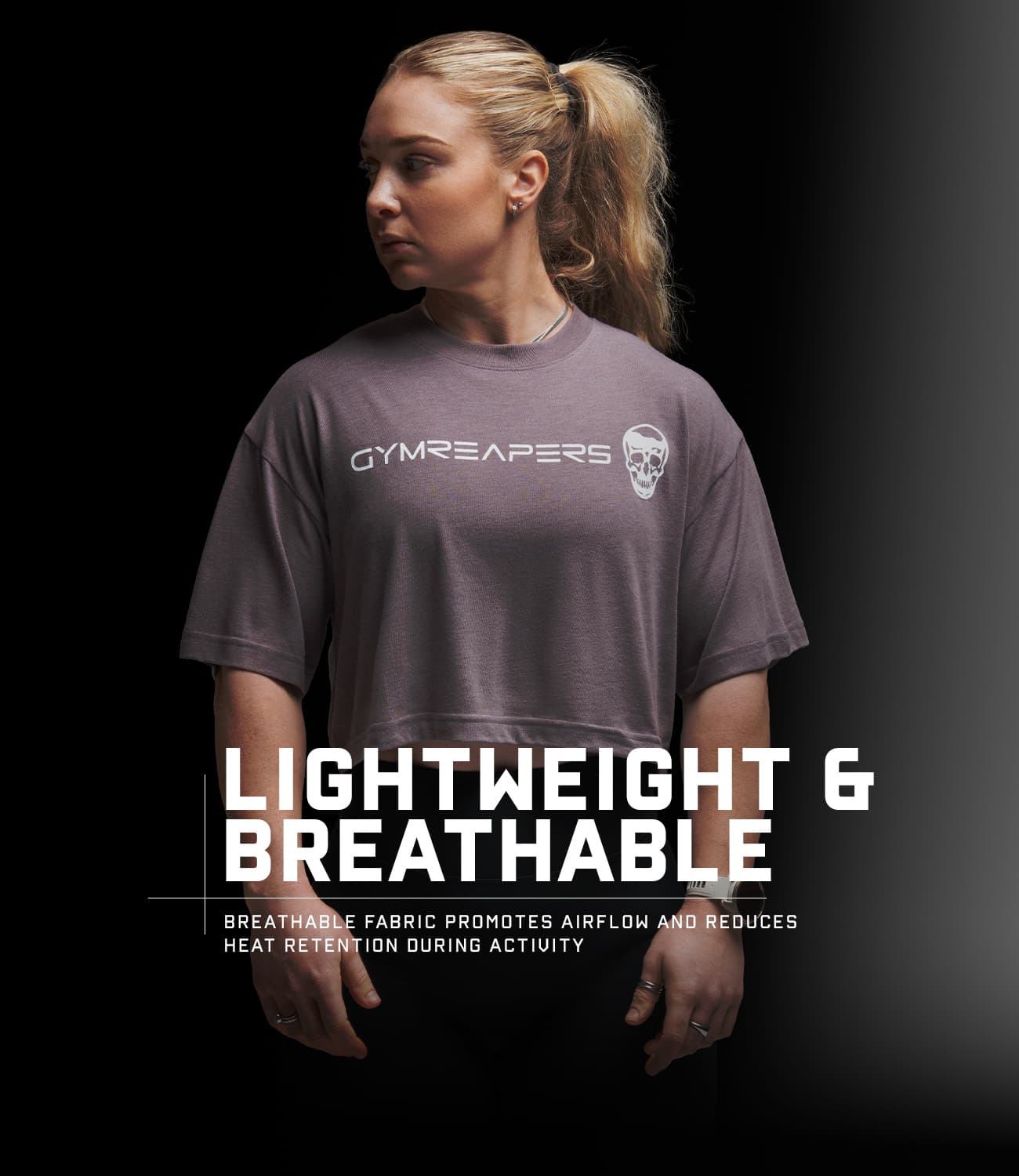 Polyester adds durability and structure, cotton enhances softness, and rayon improves drape and fluidity. Finished with a relaxed cropped silhouette and loose, boxy fit, this tee is designed to move comfortably with the body while maintaining a clean athletic look.