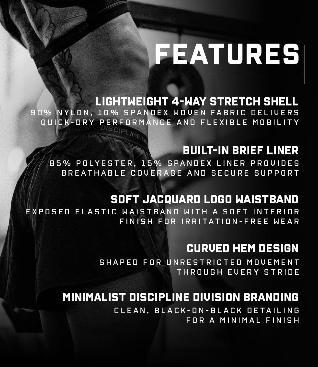 An exposed jacquard DISCIPLINE DIVISION waistband provides a supportive, locked-in feel while reinforcing the identity of the line. Finished with subtle front and back graphics, this piece balances technical performance with the bold, disciplined mindset behind the collection—commitment above all else.