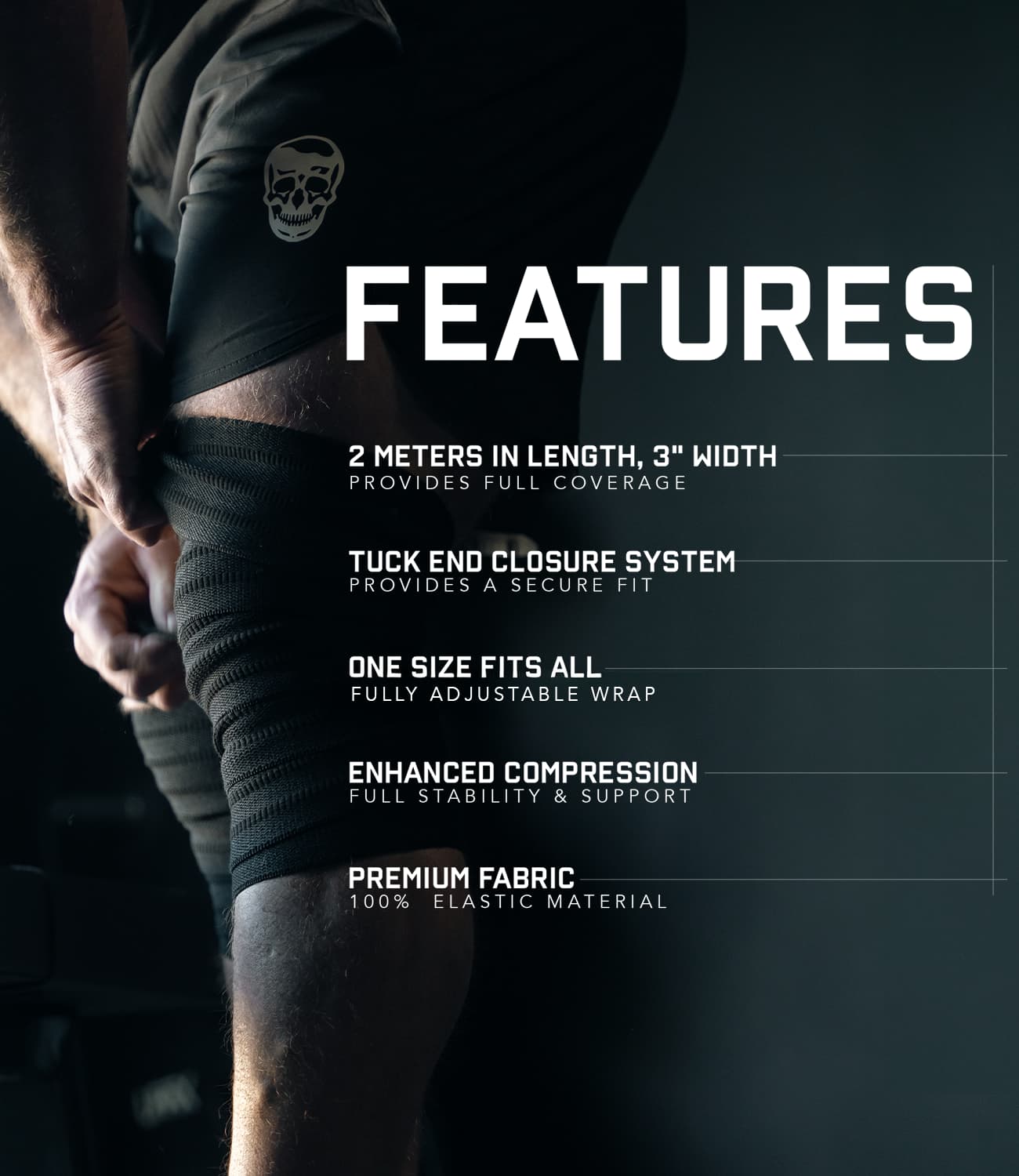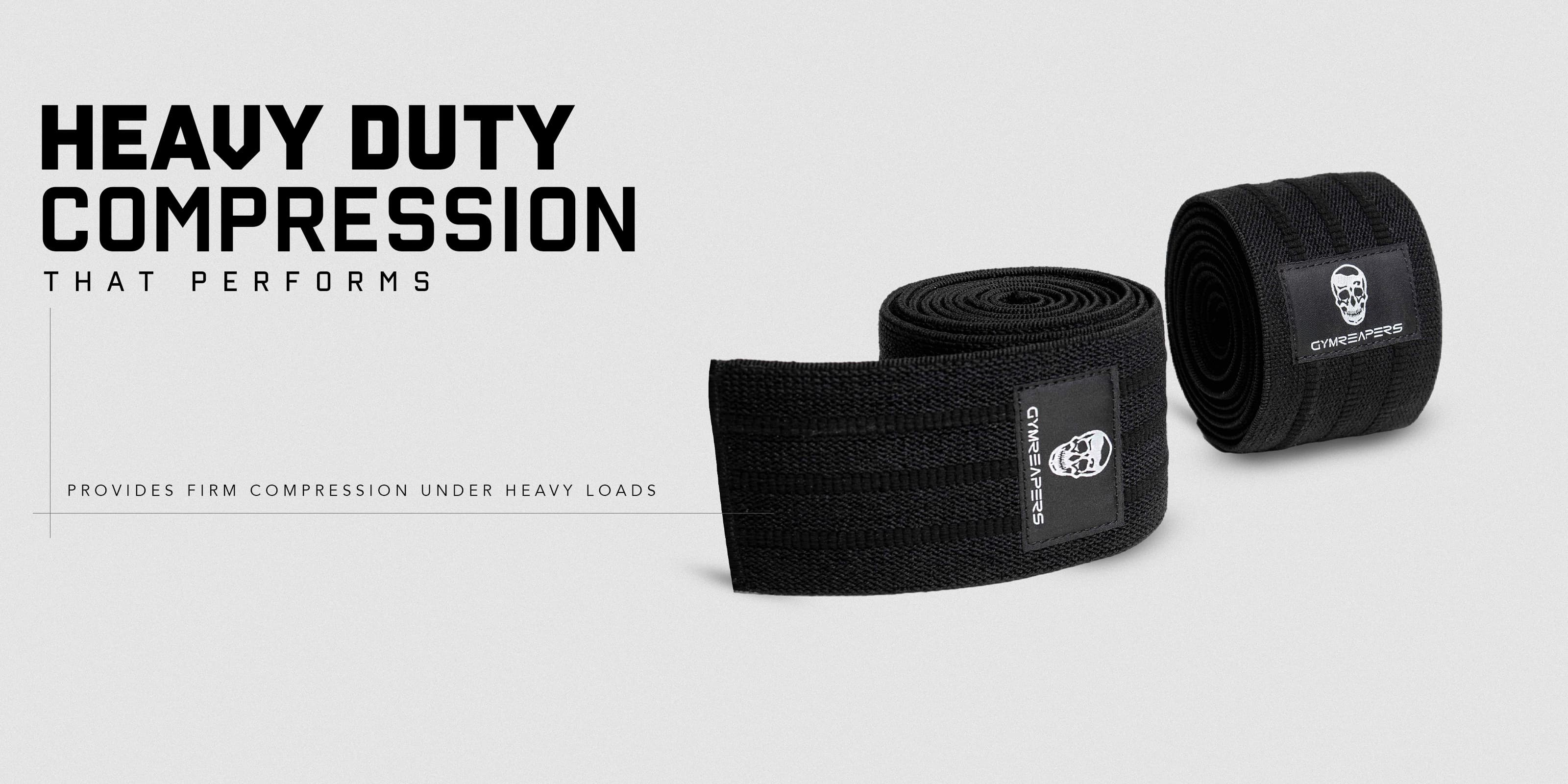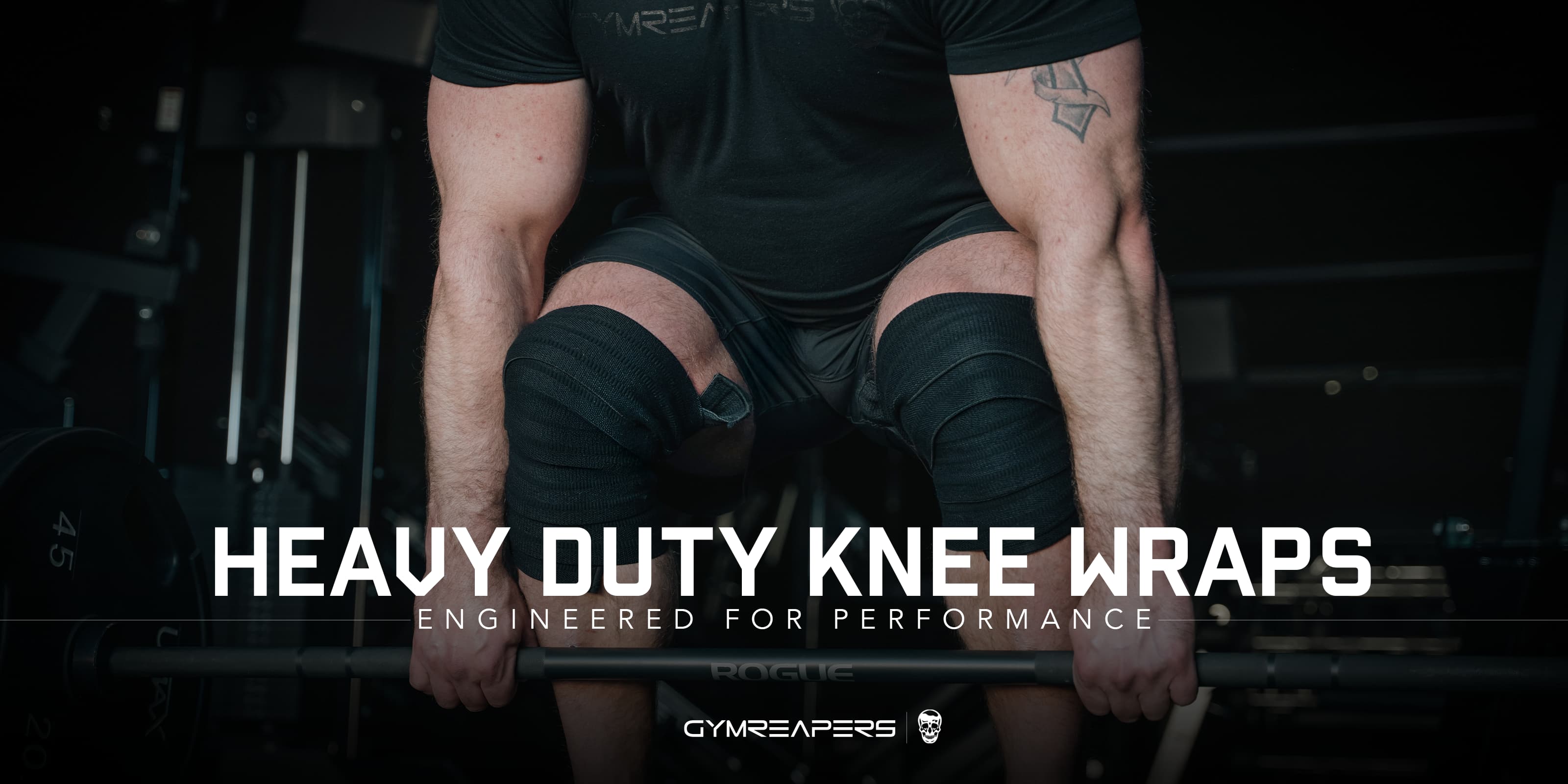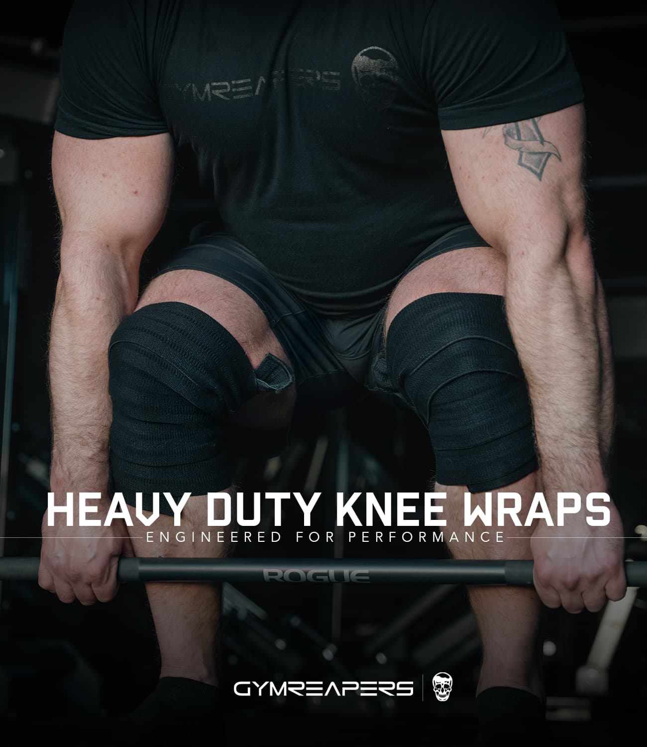 Gymreapers heavy duty knee wraps provide the compression, rebound, and joint support you need for squats, leg presses, and powerlifting. Featuring a tuck-end closure system for a secure, adjustable fit without the need for hook and loop fasteners.