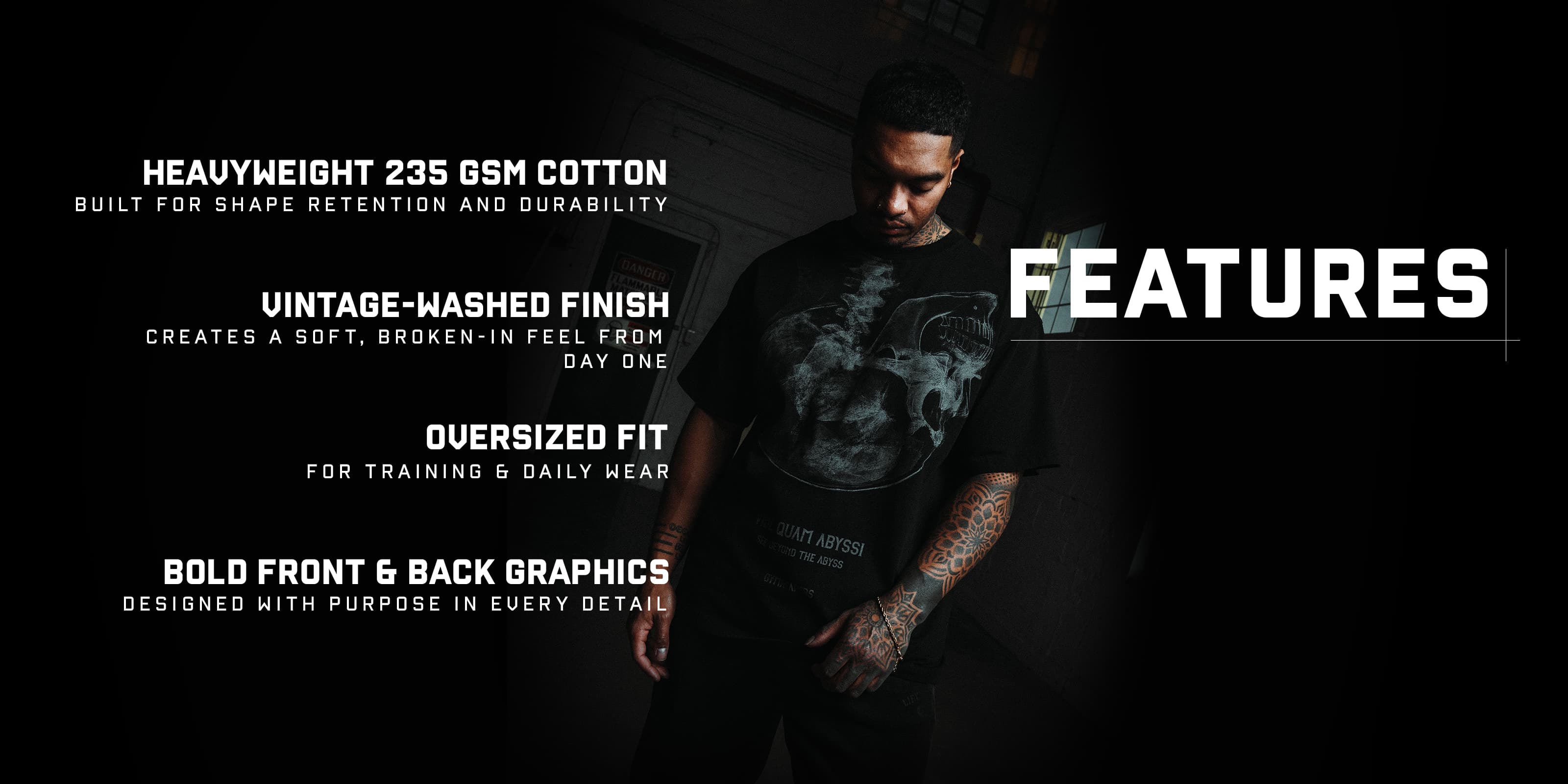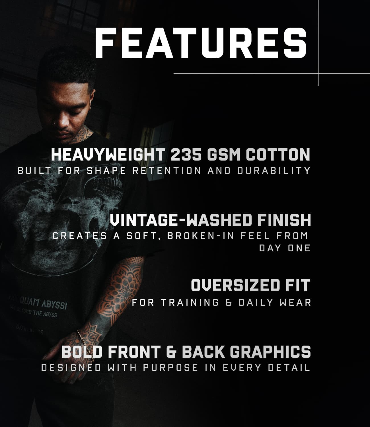 The See Beyond Tee is a reflection of perspective — a call to look deeper than what’s on the surface. Built from heavyweight cotton for structure and comfort, this oversized tee features a faded skeletal graphic and the phrase “Vide Quat Abyssi” (See Beyond the Abyss). Designed for those who embrace the unknown, it’s a reminder to keep pushing past limits both in and out of the gym.