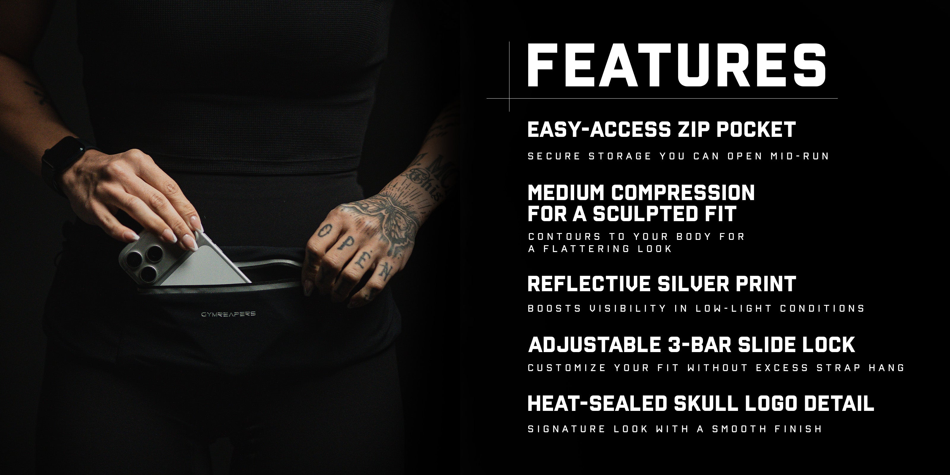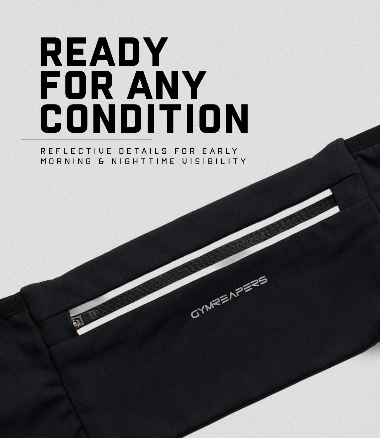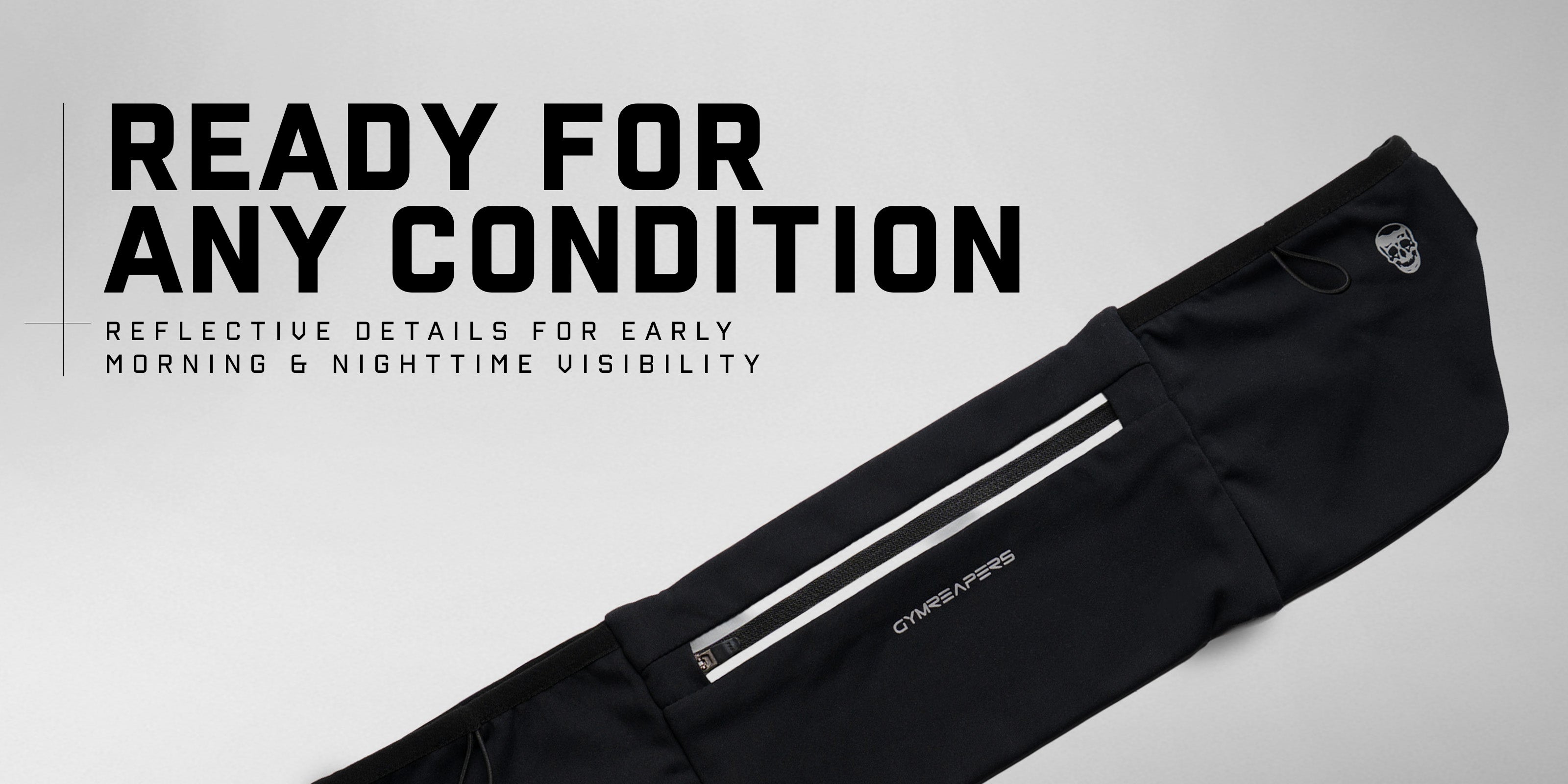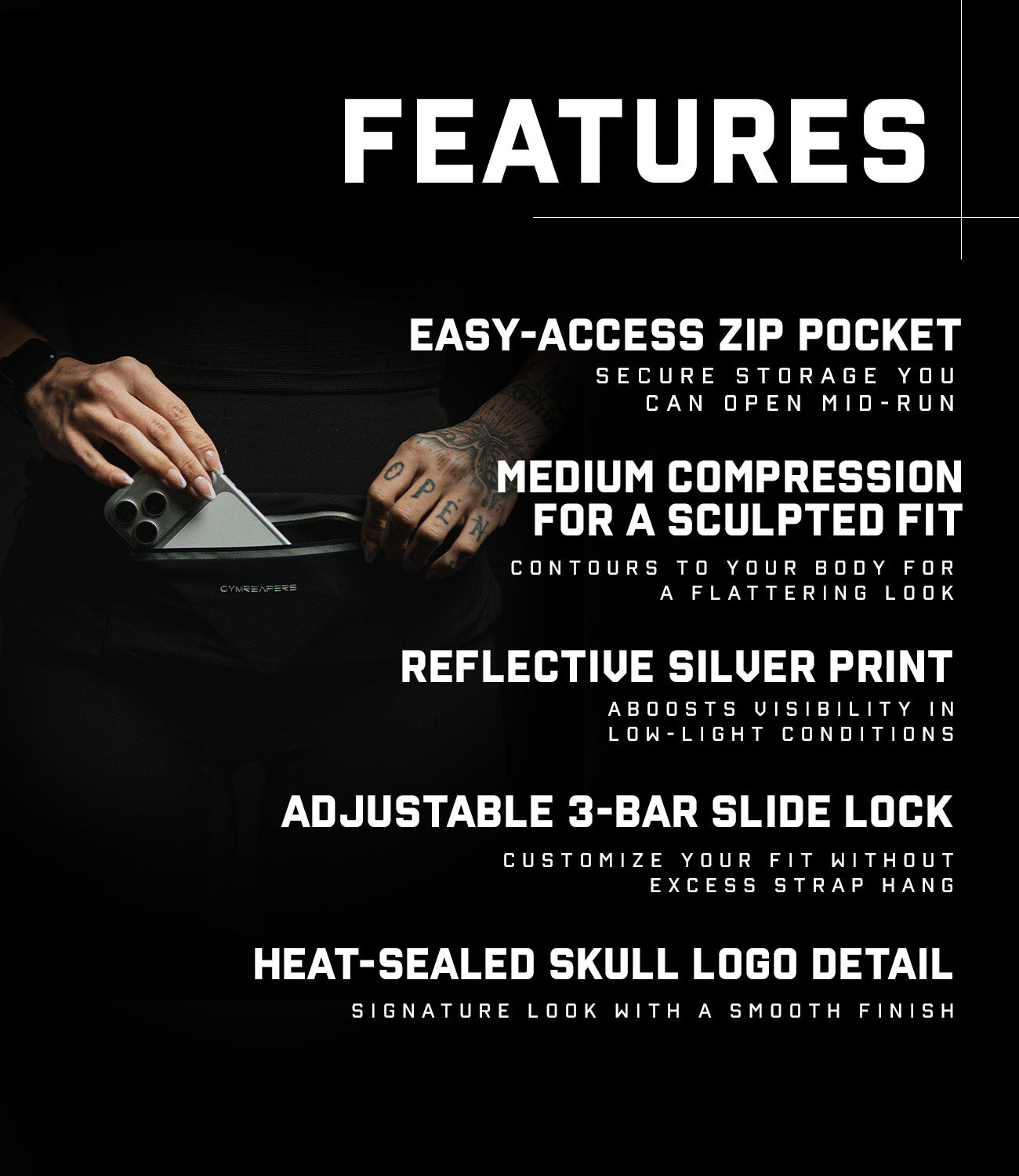 A dual-zone storage layout keeps fuel and valuables organized, while an adjustable buckle system delivers a comfortable, customizable fit. Reflective details and reinforced construction round out a streamlined belt built for consistent performance on every run.